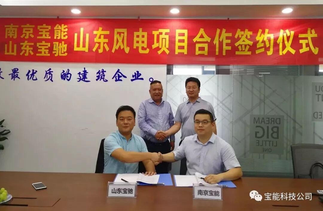 2018年5月22日下午14时,南京宝能科技与山东宝驰集团在南京举行山东风电项目合作签约仪式。南京宝能科技董事长李建国先生、总经理陈磊先生,山东宝驰集团董事长刘蜀一先生、集团副总经理杜义先生等人参加了此次签约仪式。